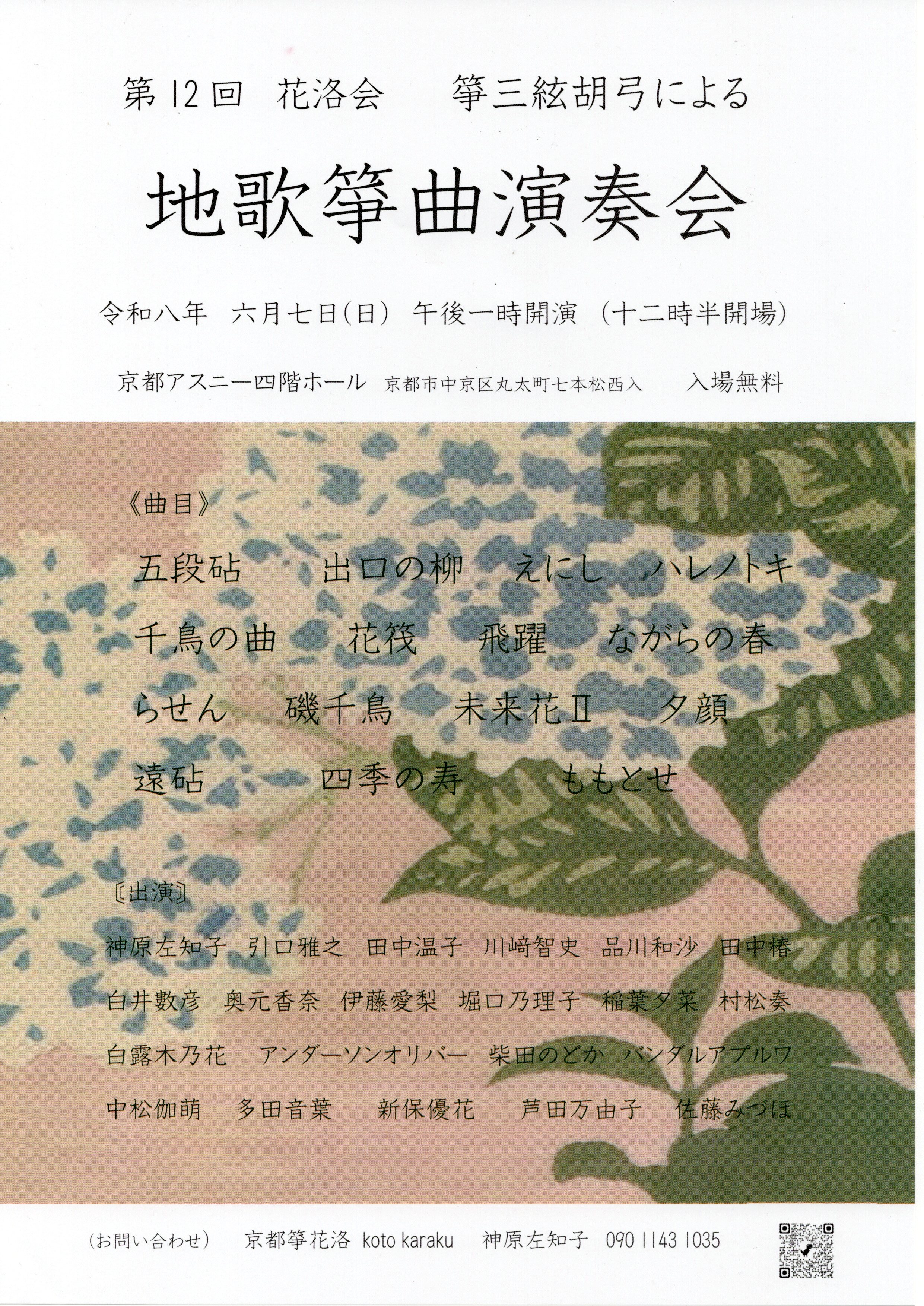 第12会 花洛会 筝三絃胡弓による 地歌箏曲演奏会 | 2026年6月7日(日) 13:00 開演 | 京都アスニー | 四階ホールになります |